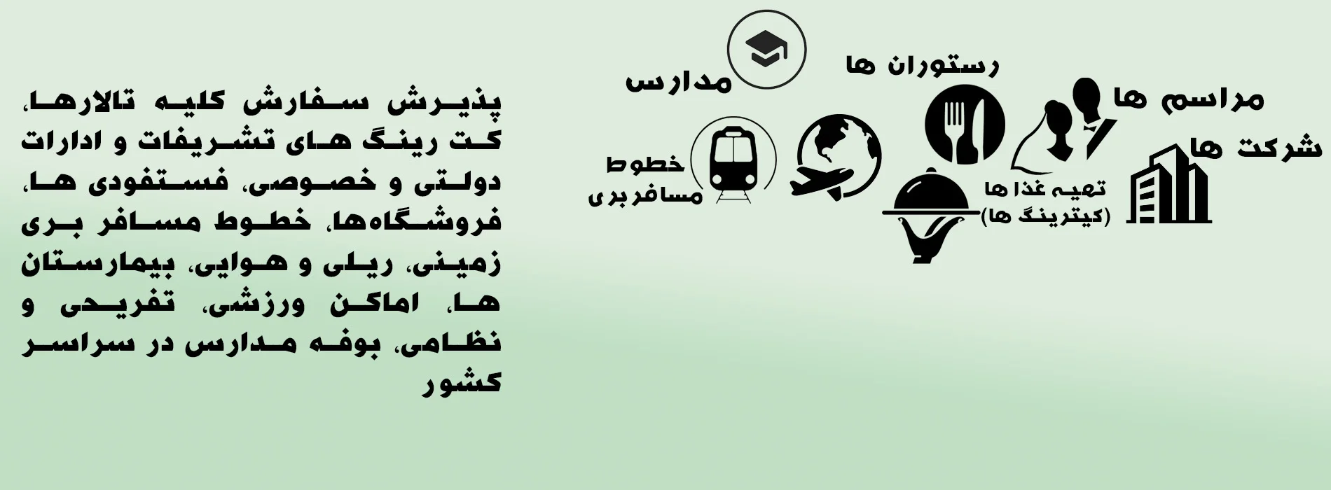 این شرکت افتخار دارد تا ضمن برخورداری از چندین خط مجهز تولید و استفاده از فن آوری نوین و دستگاههای تمام اتوماتیک، ضمن تأمین نیاز مشتریان بالفعل خود، نسبت به پذیرش سفارش کلیه تالارها، کت رینگ های تشریفات و ادارات دولتی و خصوصی، فستفودی ها، فروشگاهها، خطوط مسافر بری زمینی، ریلی و هوایی، بیمارستانها، اماکن ورزشی، تفریحی و نظامی، بوفه مدارس و… در سراسر کشور آمادگی خود را جهت تأمین روزانه این دسته از محصولات تازه غذایی، با بهترین کیفیت در تولید و ارسال، مناسبترین روش سفارش گیری و رقابتیترین قیمت اعلام نماید.